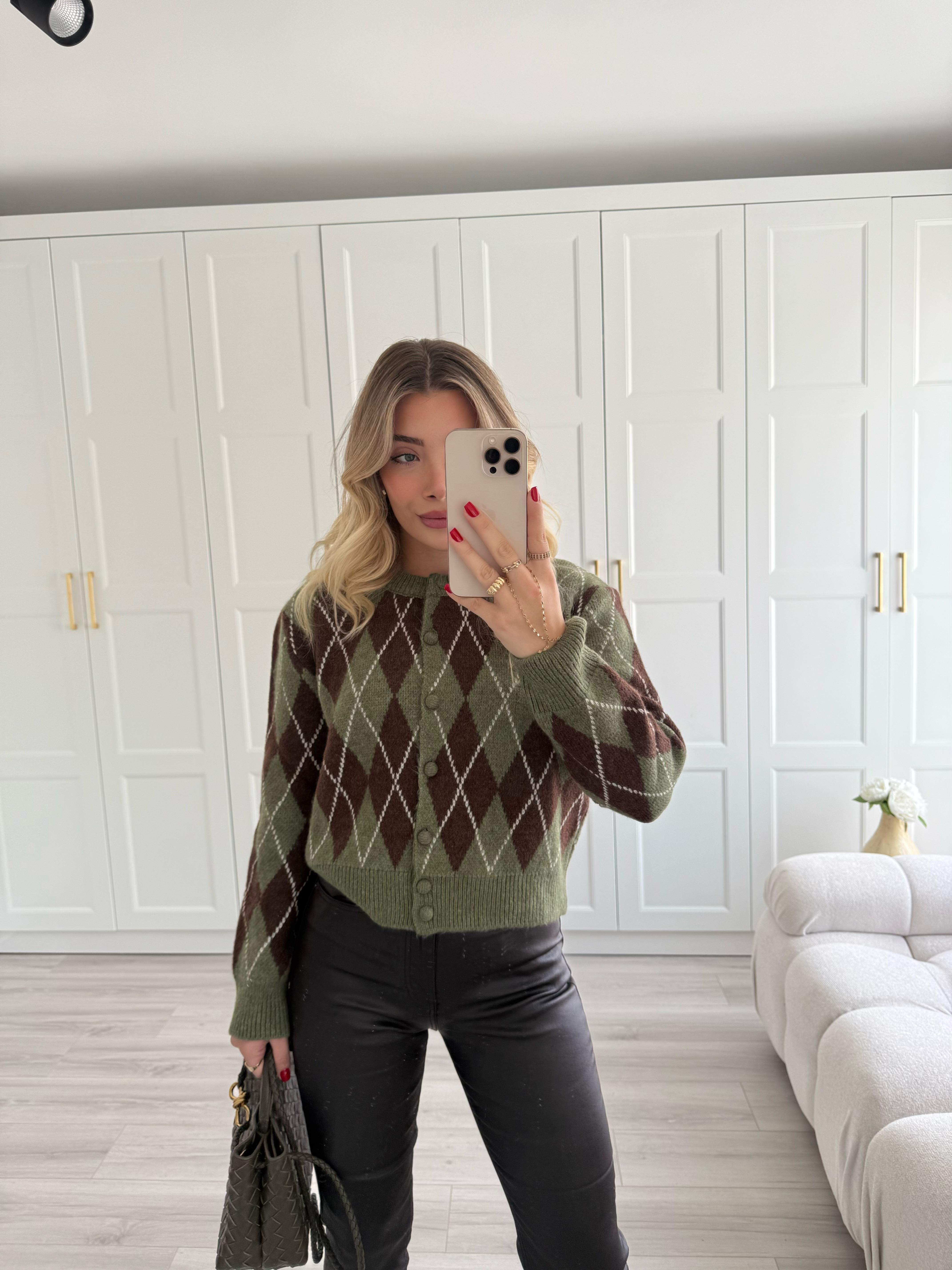 Açık Yeşil-Koyu Tarçın Baklava Desenli Hırka-1056 (ck-8876)