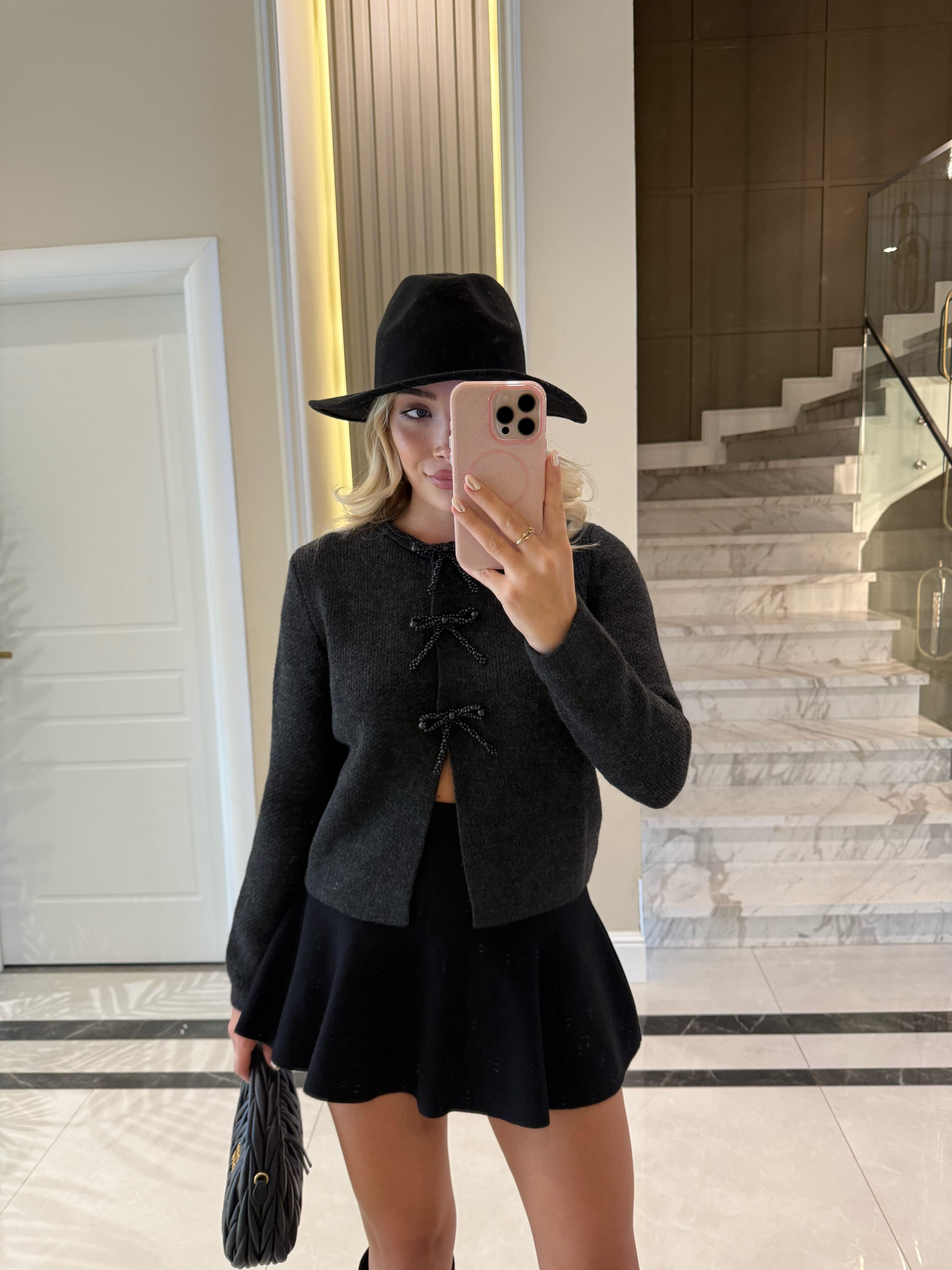 Antrasit İncili Fiyonk Aksesuarlı Triko Hırka -60983 (ck-9776)