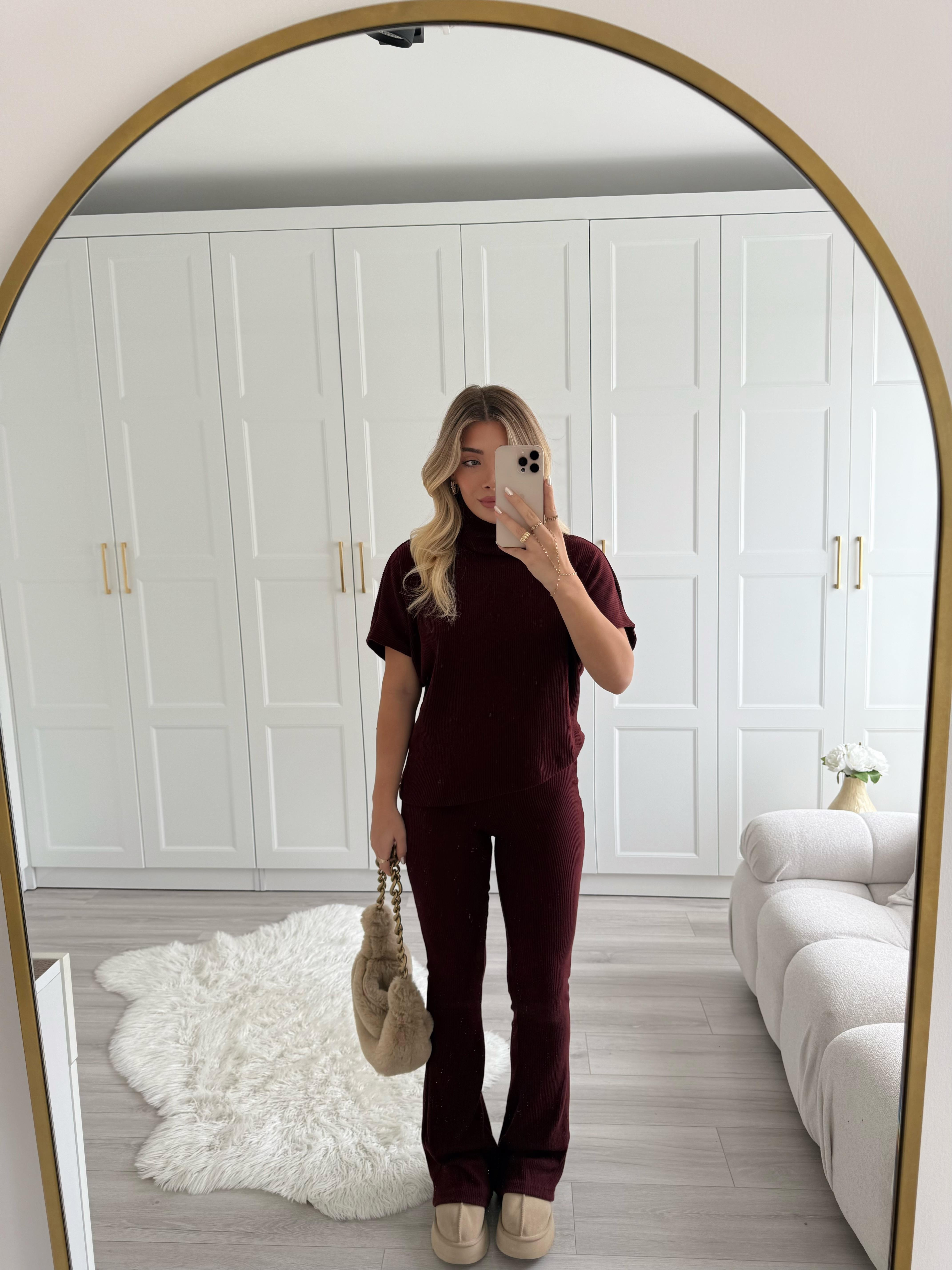 Bordo Asimetrik Top- Örme Pantolon Takım 32239