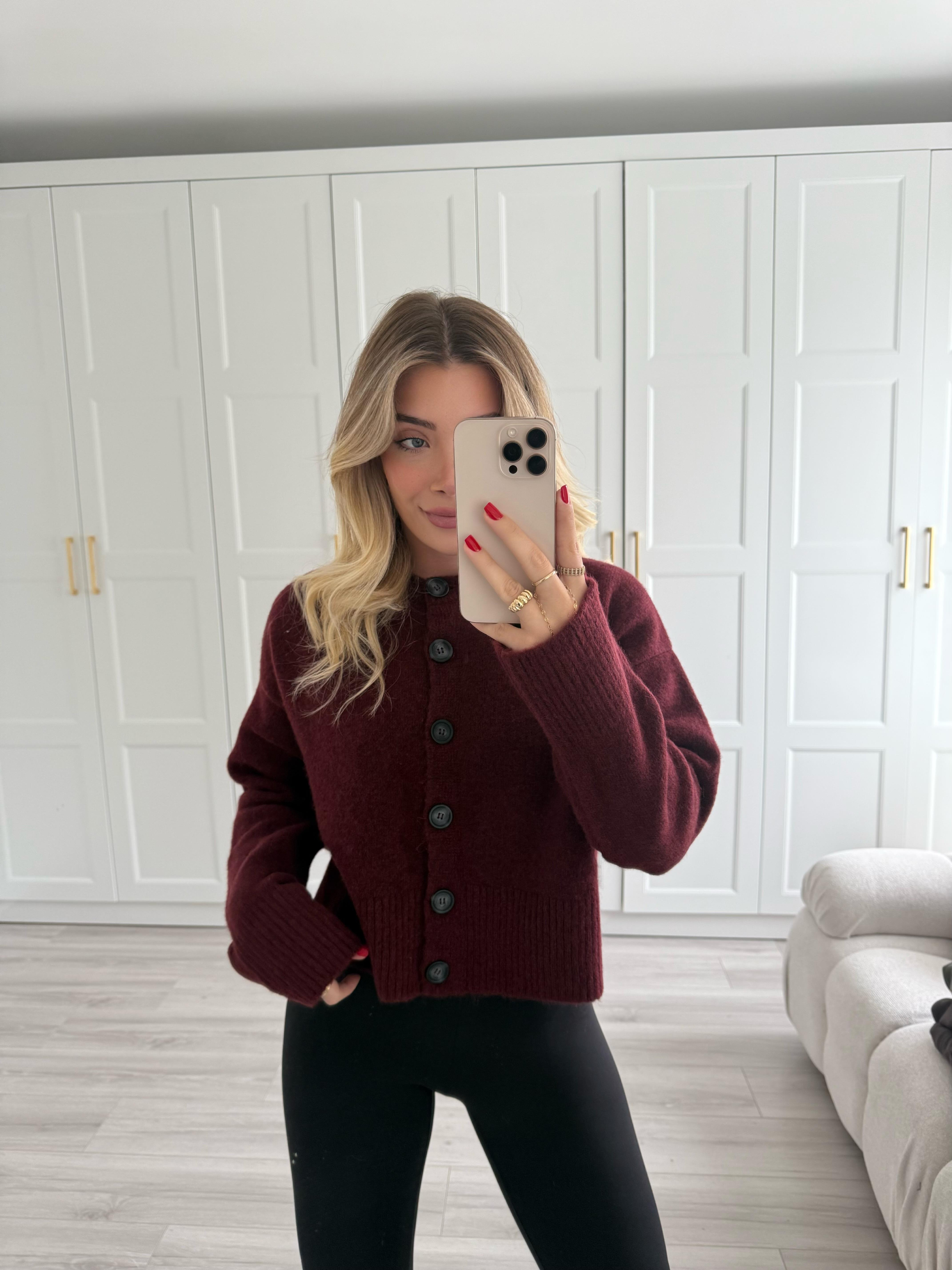 Bordo Melanj Dik Yaka Düğmeli Yumuşak Dokulu Yırtmaçlı Triko Hırka-60280 (ck-0987)
