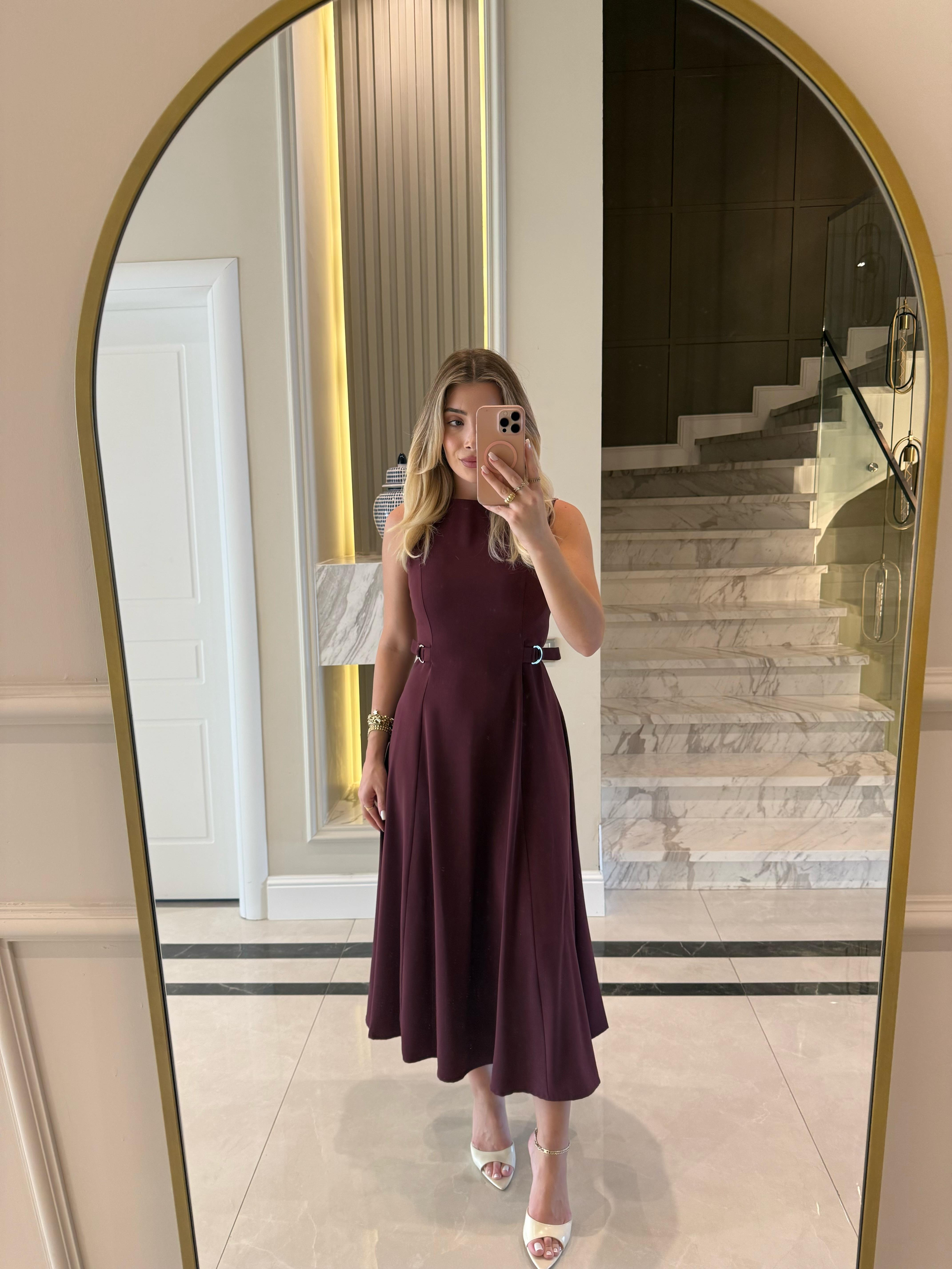 Bordo Parçalı Kemer Detaylı Elbise