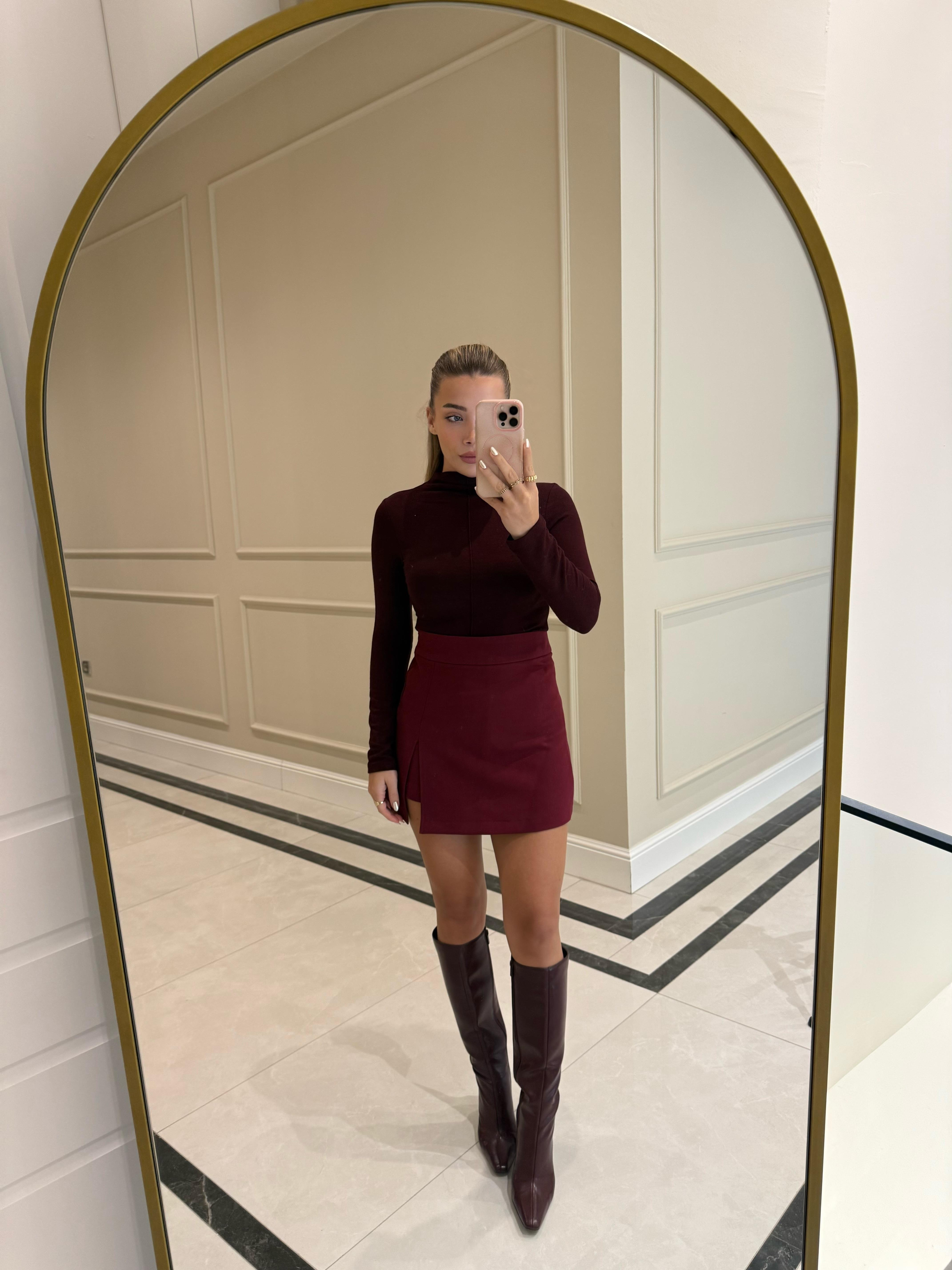 Bordo Yırtmaçlı Şort Etek-5179