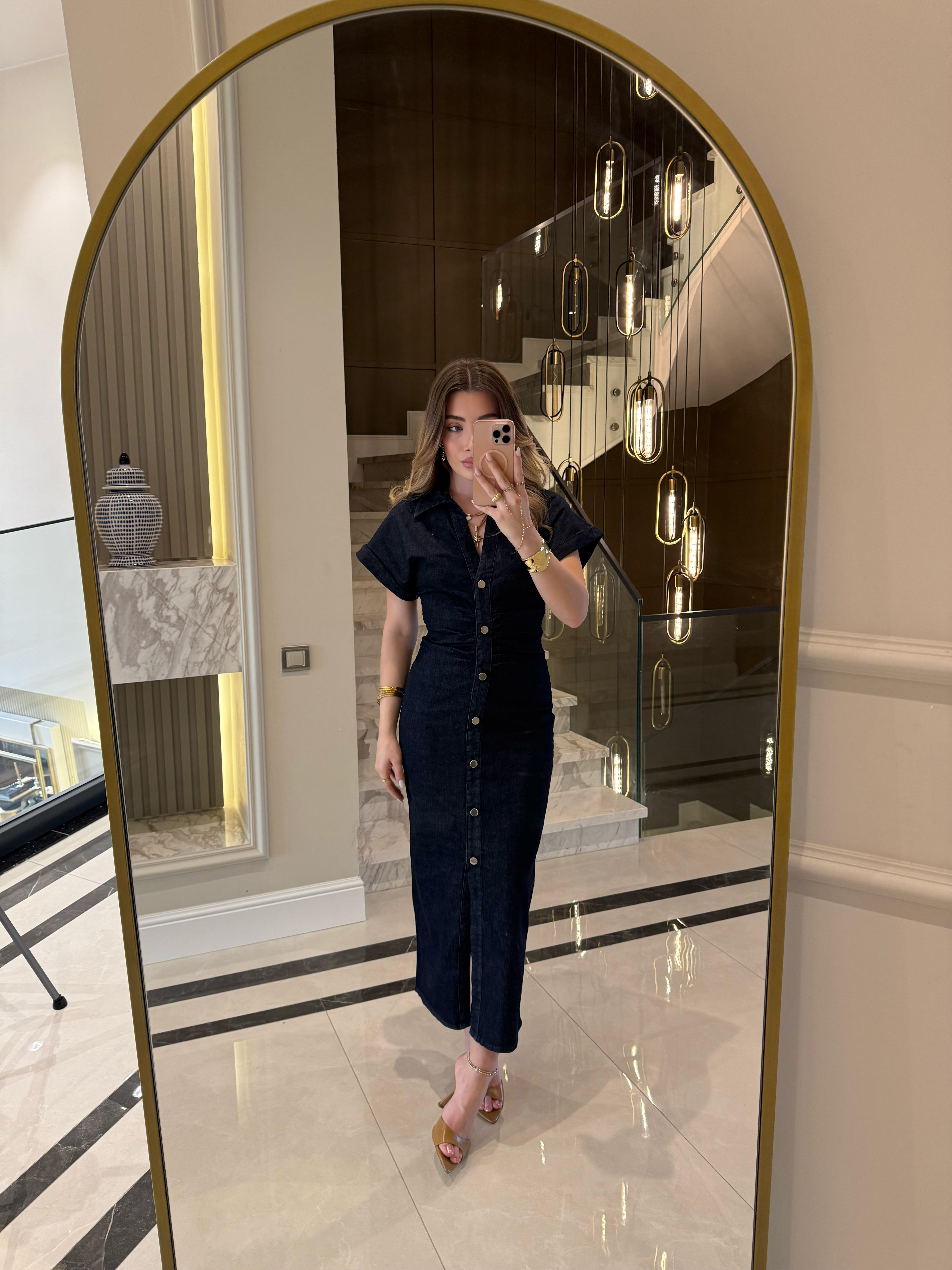 Drapeli Tasarım Denim Midi Elbise