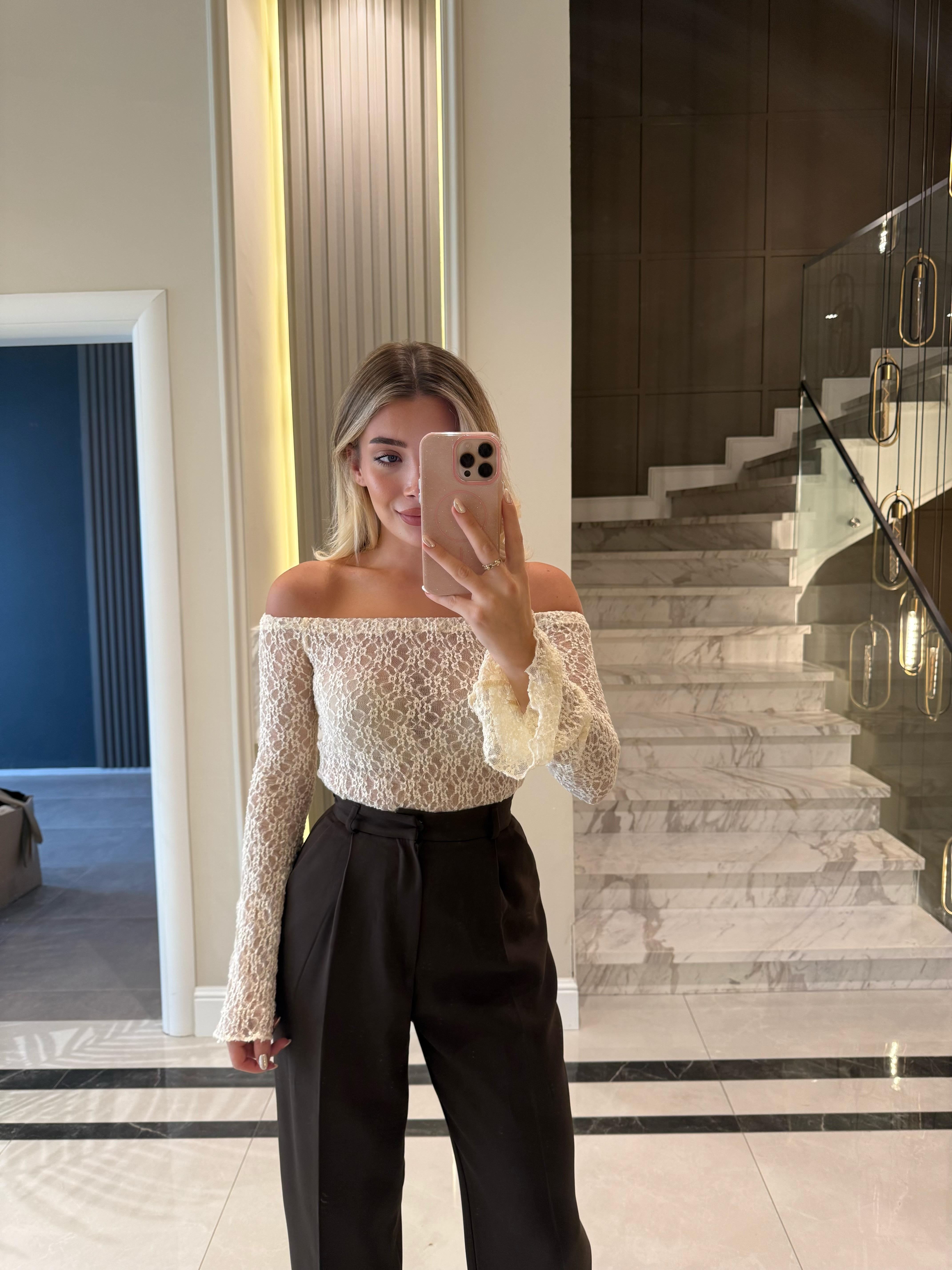 Ekru Madonna Yaka İapanyol Kollu Dantel Bluz-1011