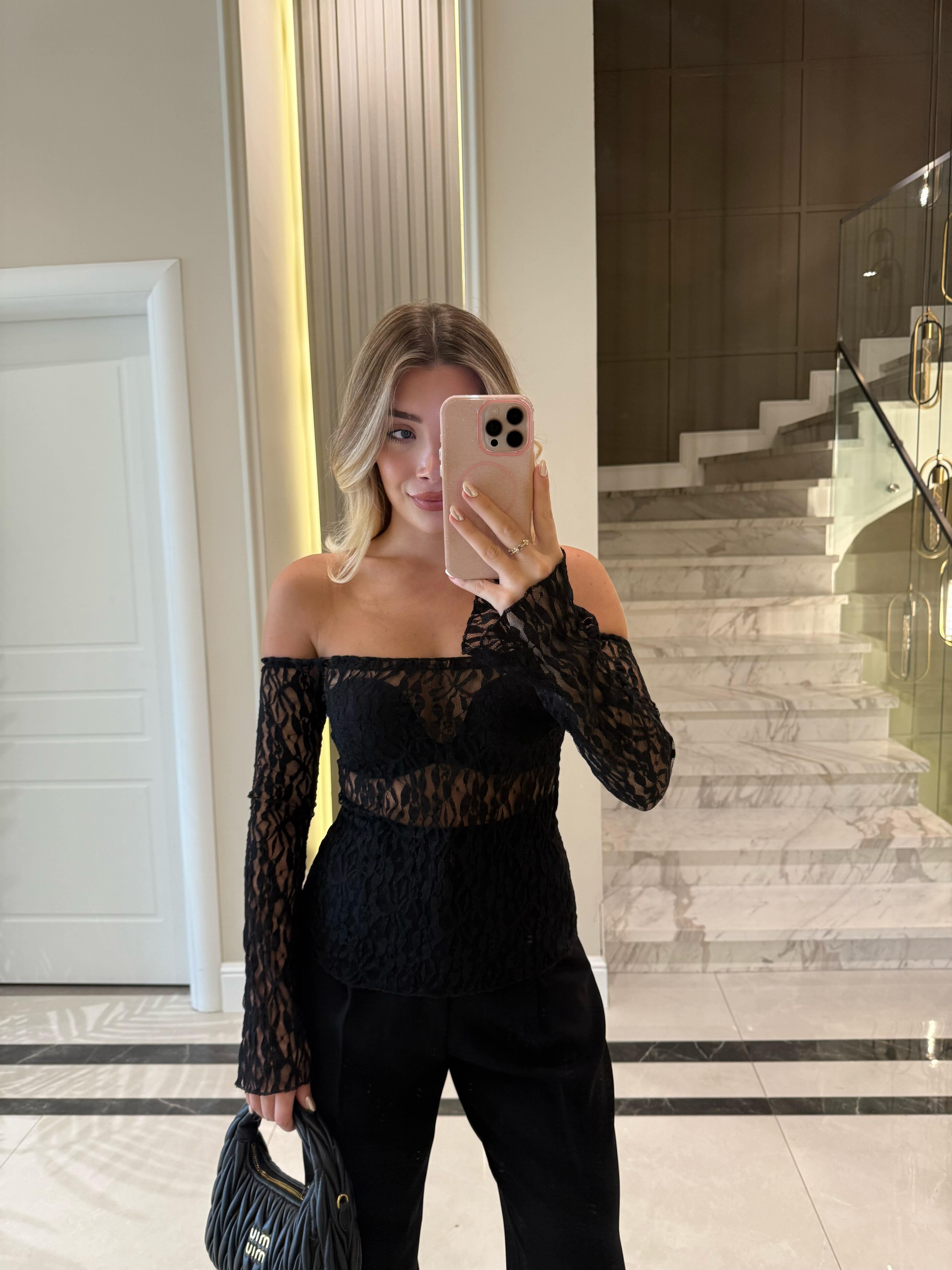 Siyah Madonna Yaka İapanyol Kollu Dantel Bluz-1011
