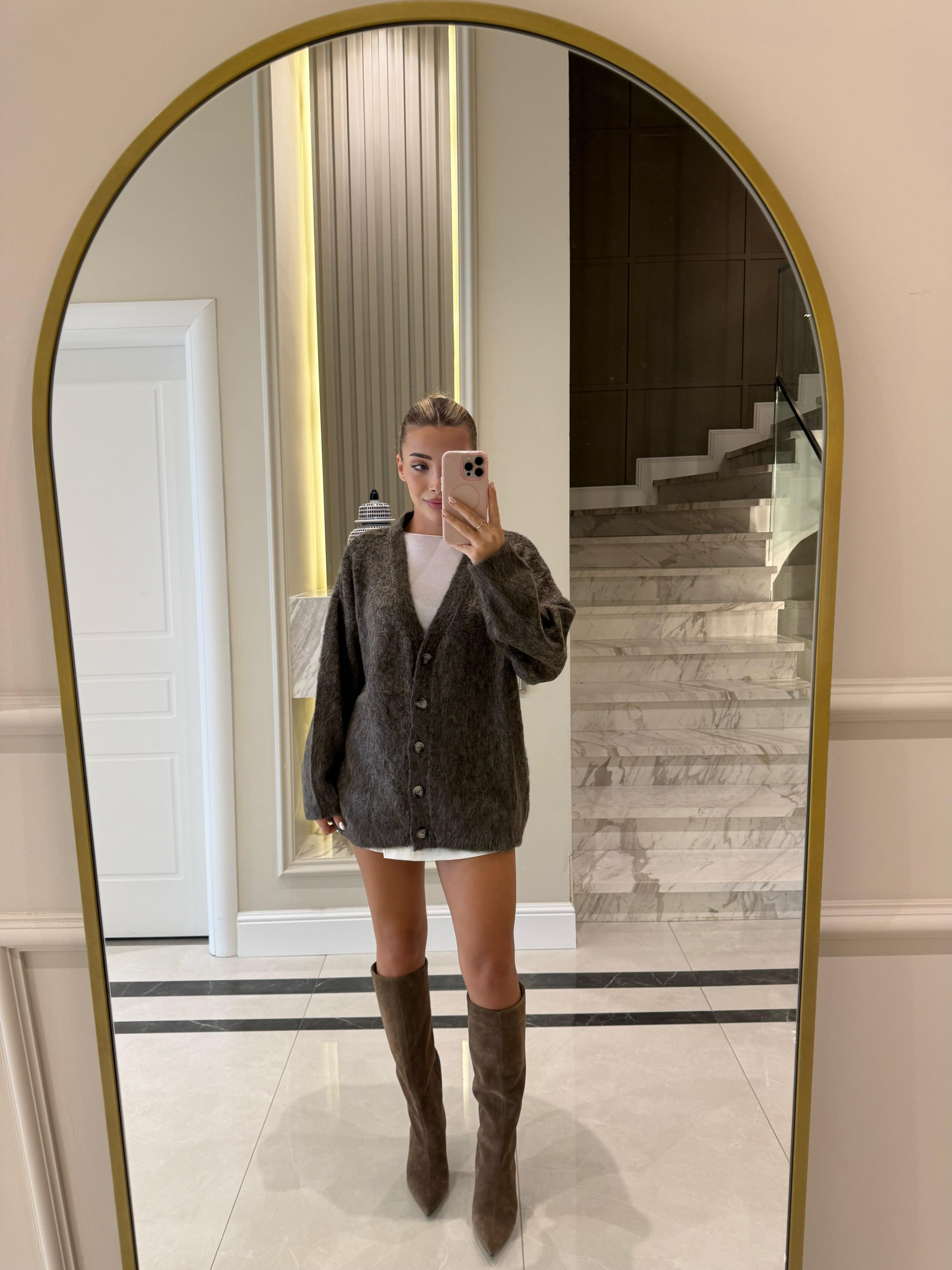 Kahve V Yaka Şardonlu Düğmeli Triko Hırka