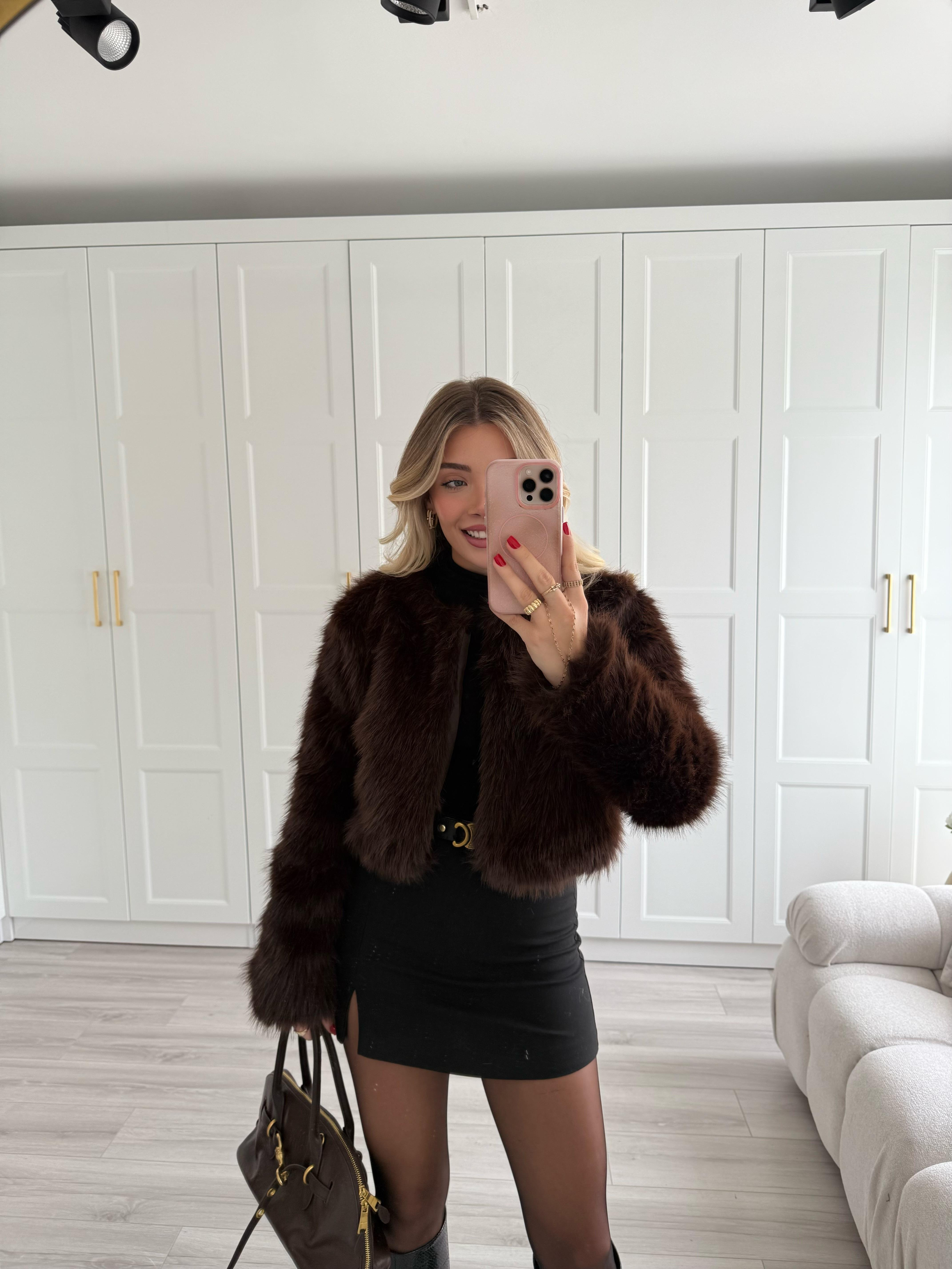 Kahverengi Sıfır Yaka Kısa Kürk