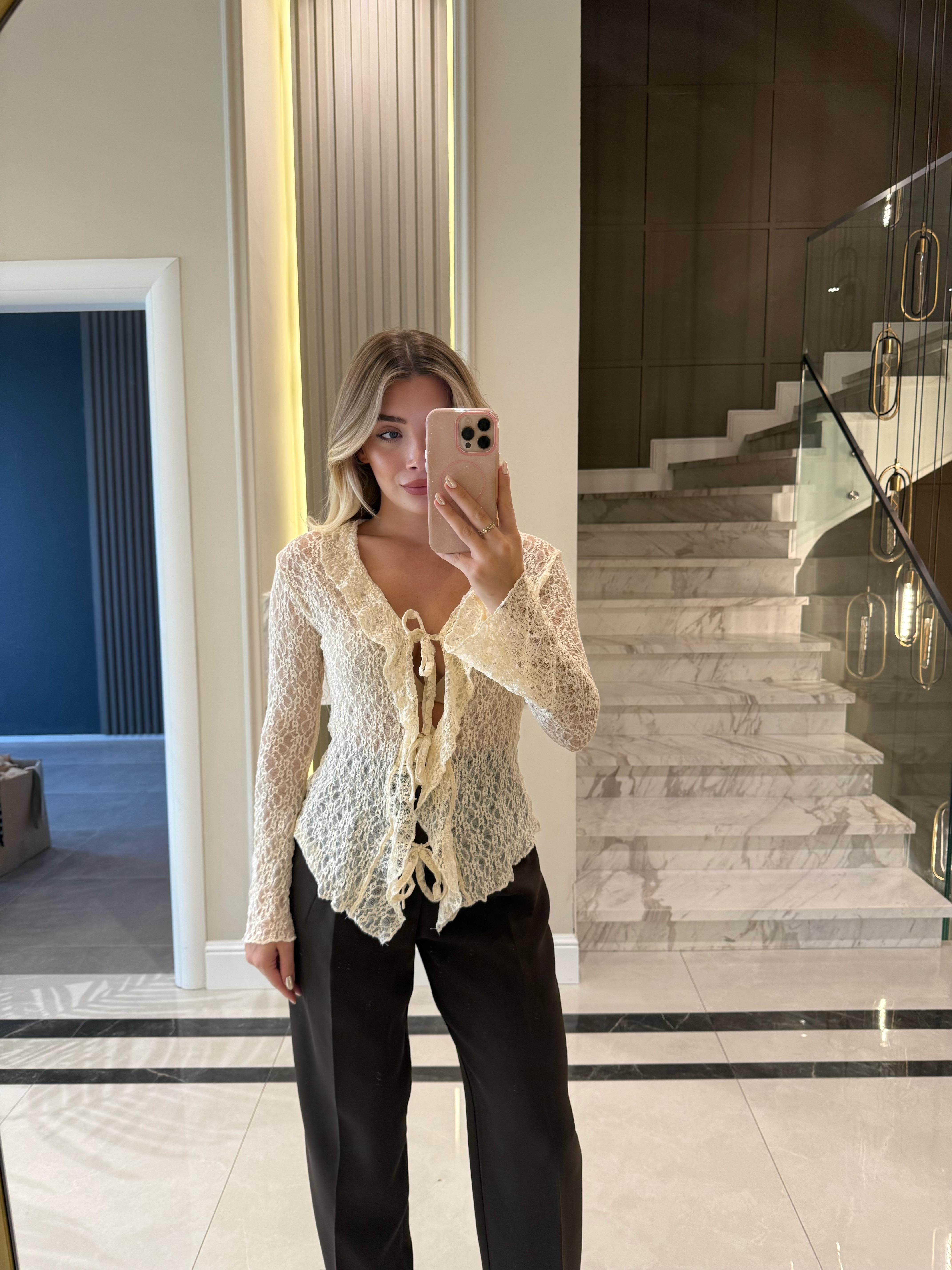 Krem Önü Bağlamalı Transparan Bluz -1012