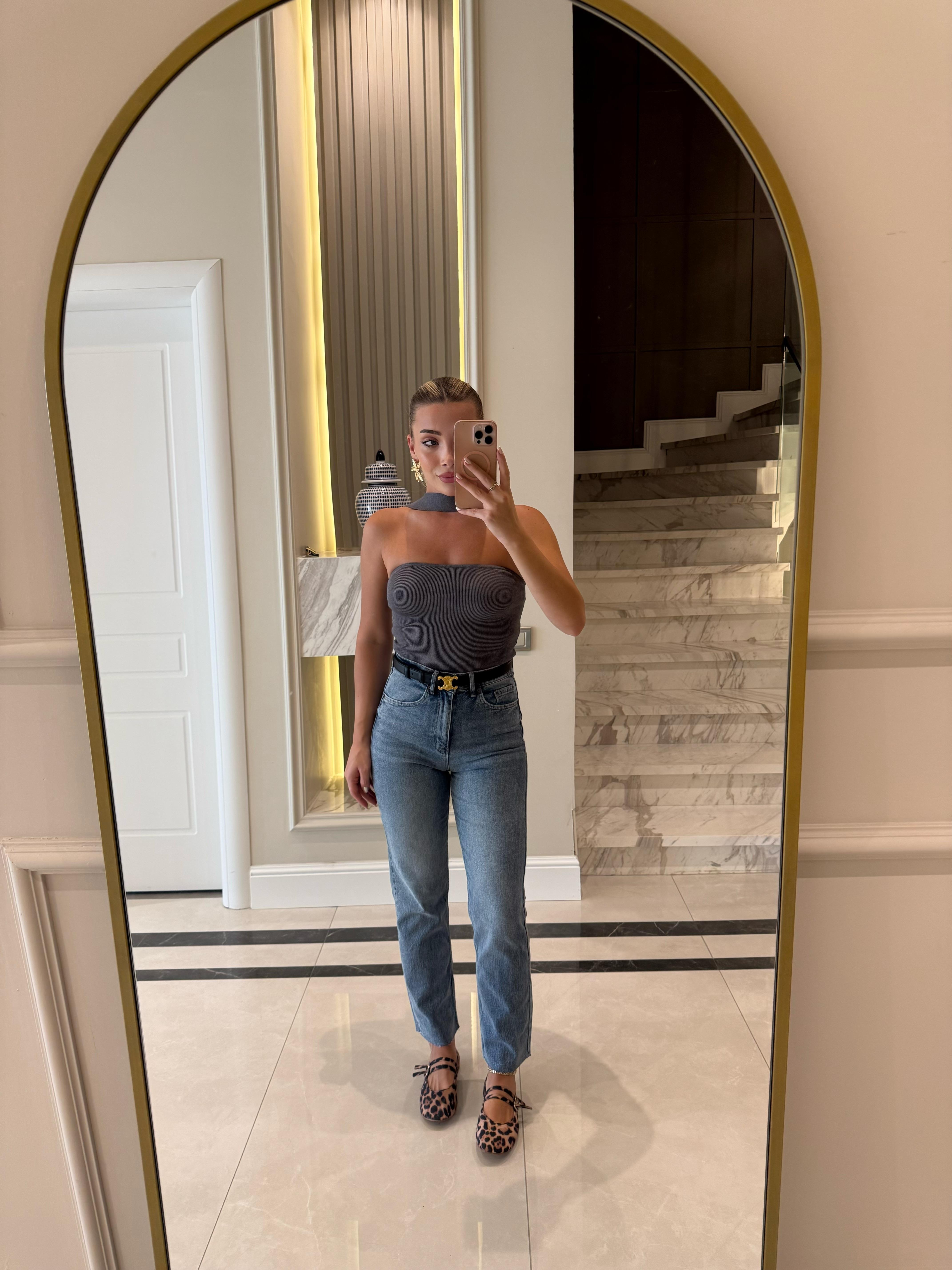 Orta Gri Boyundan Askılı Triko Bluz-1003
