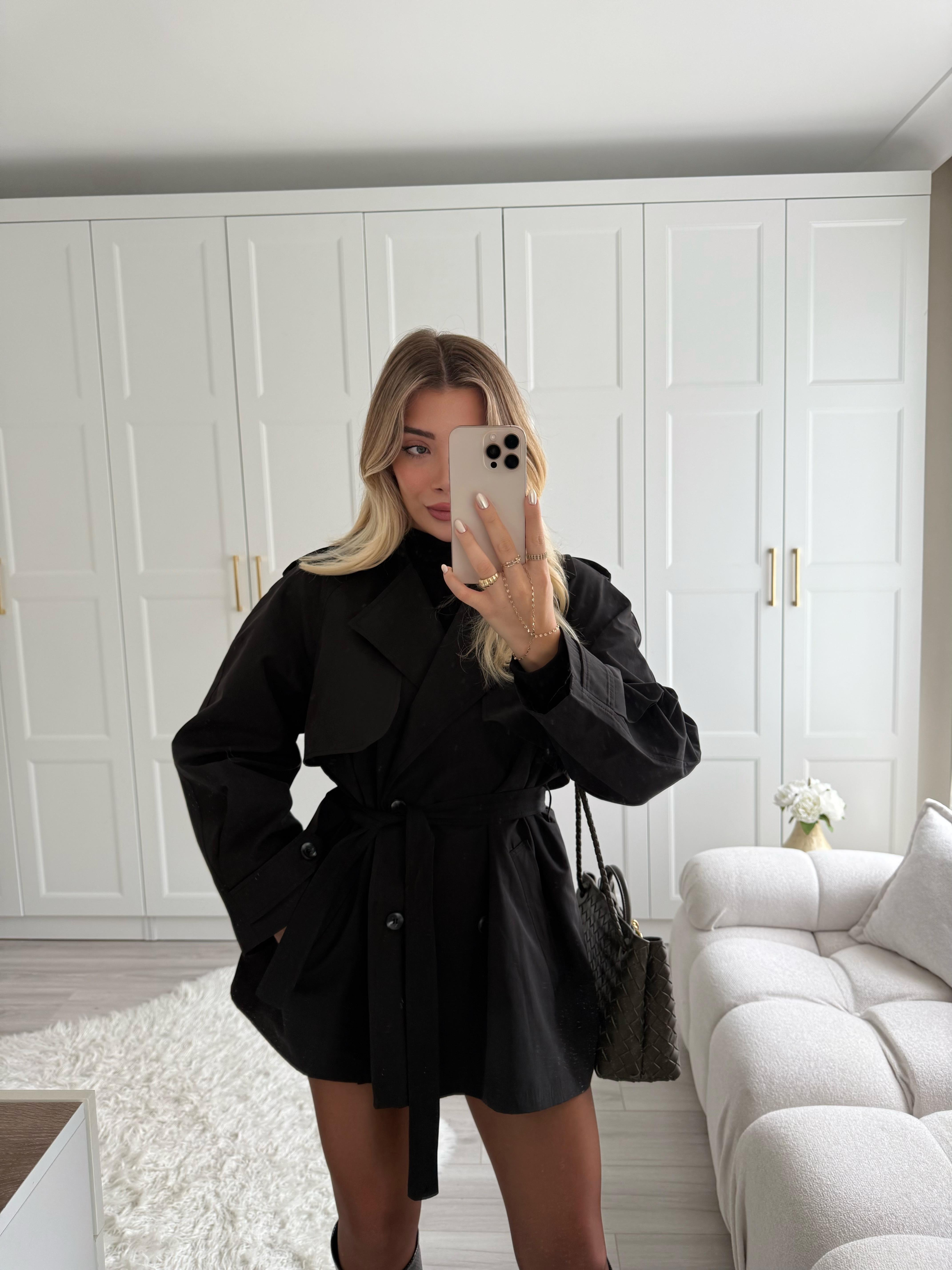 Siyah Ara Boy Kruvaze Trençkot-7556