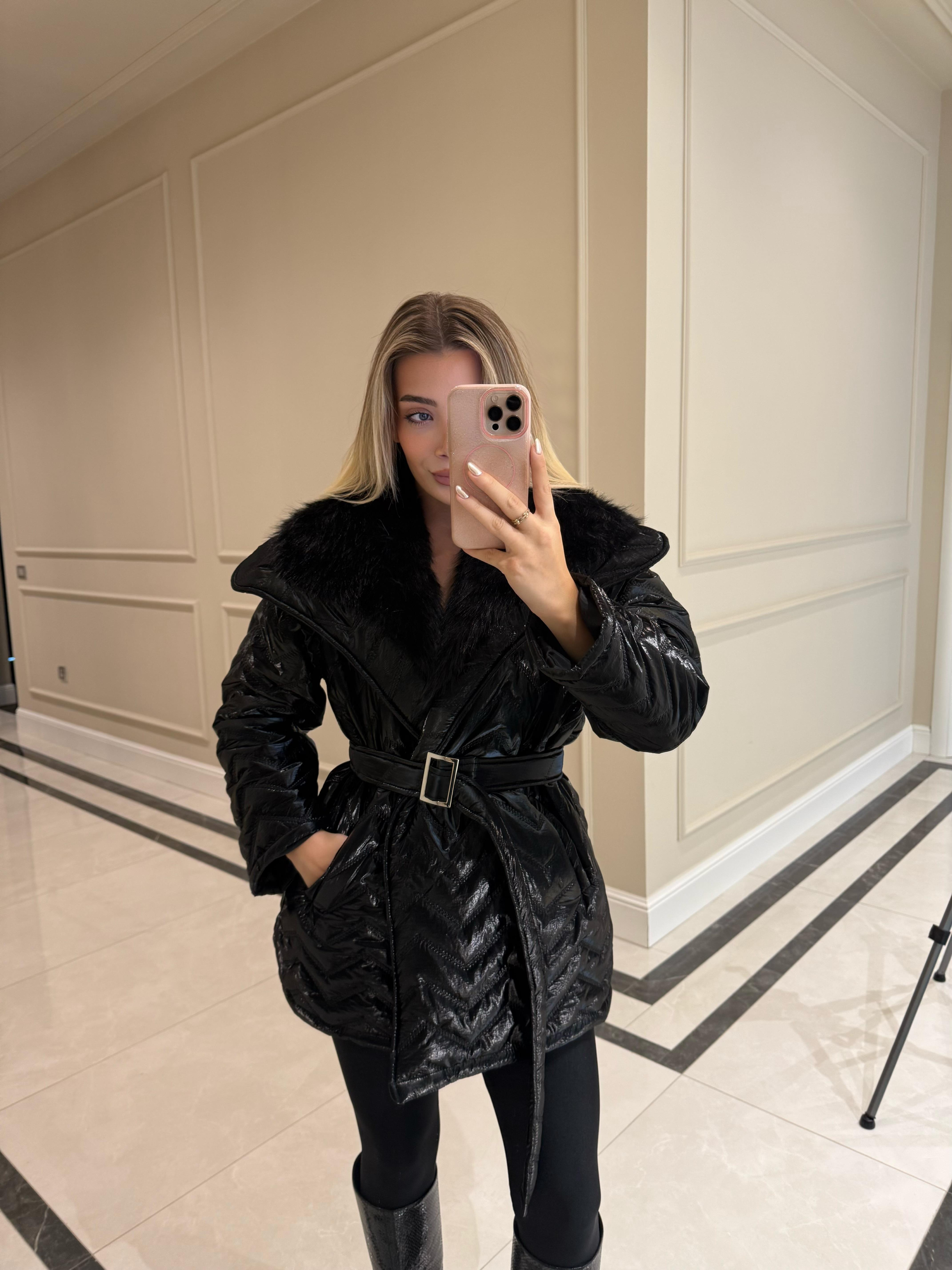 Siyah Rugan Kürk Detaylı Şişme Mont
